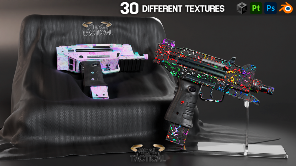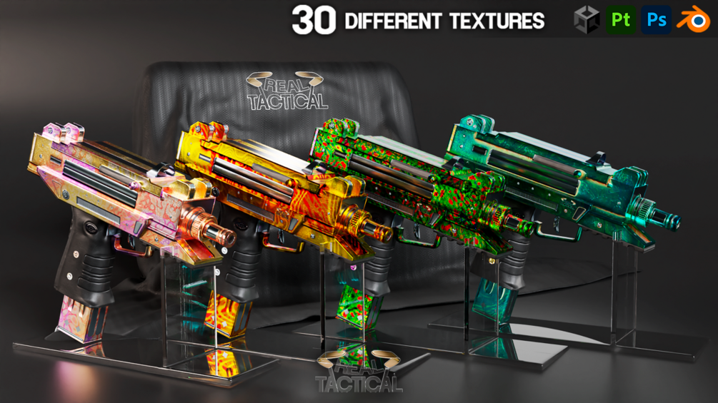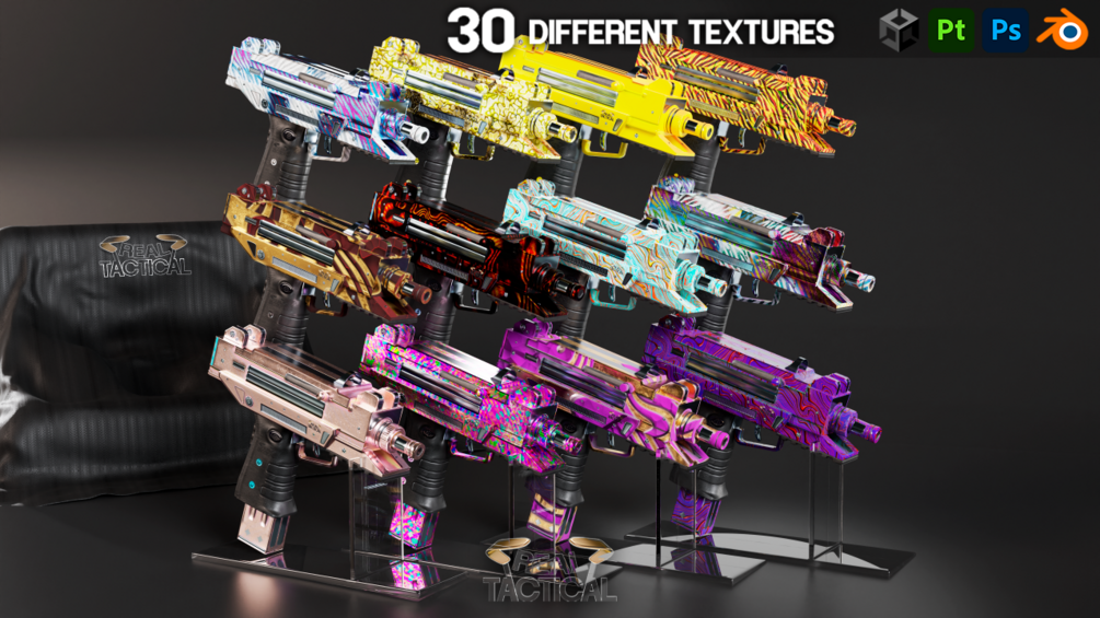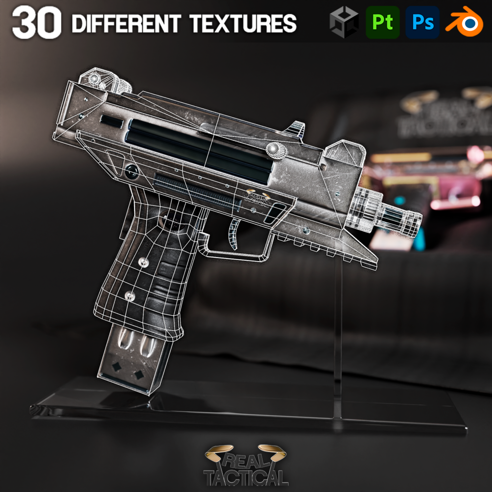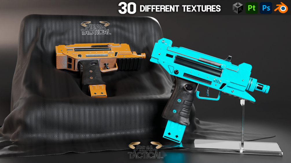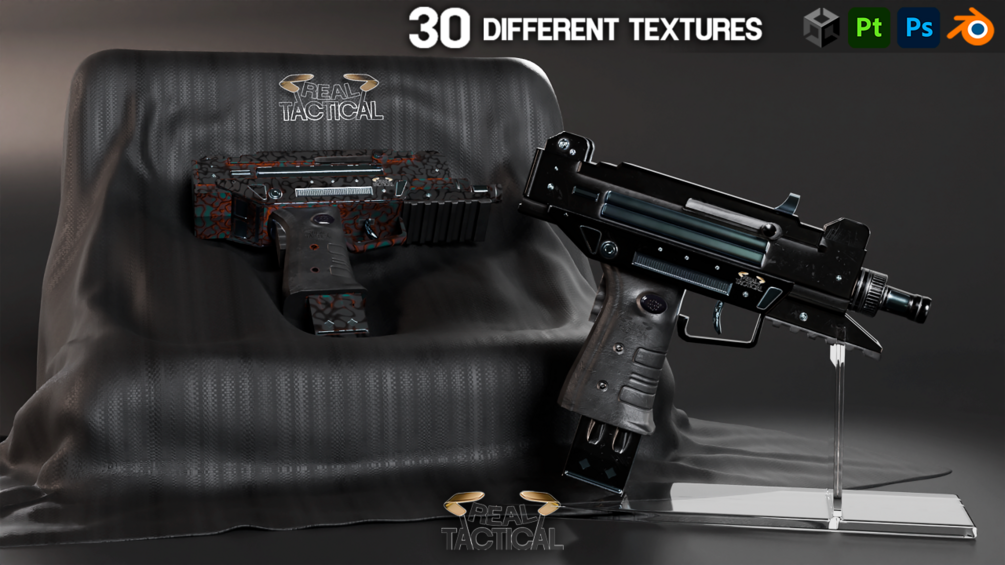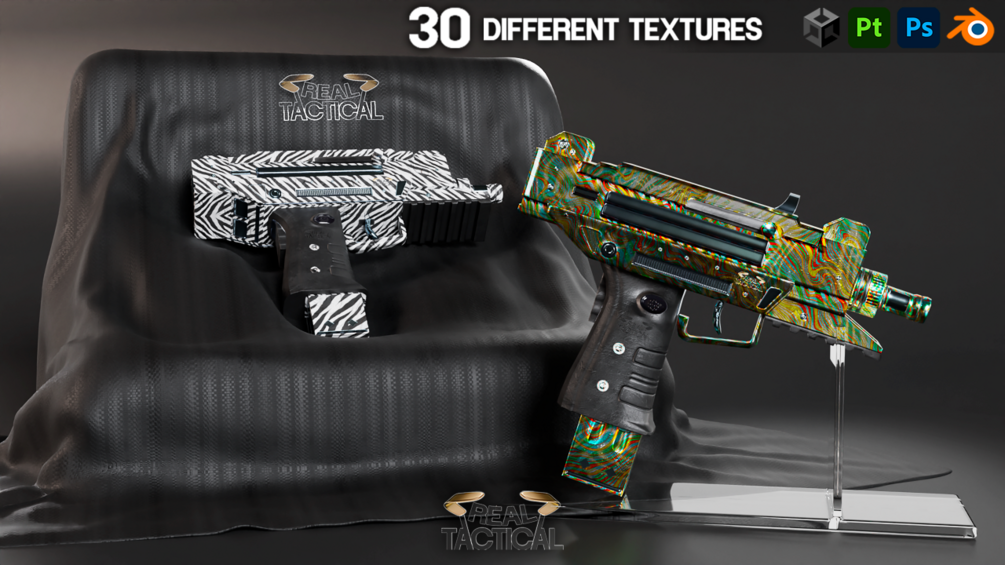 You will receive an .fbx file, a .blend file, and 30 different Uzzi textures.